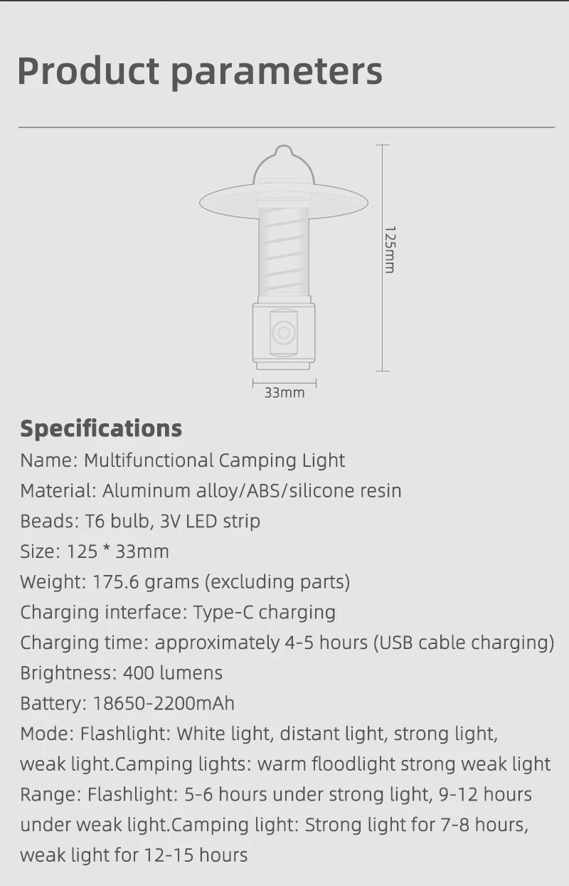 Camping light mode: Strong light for 7-8 hours,weak light for 12-15 hours