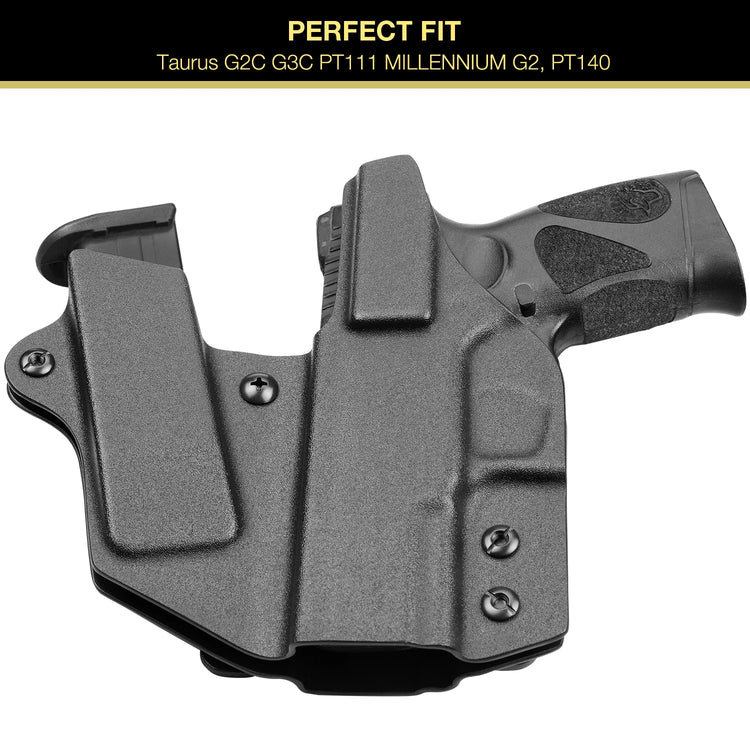 【Taurus G2C HOLSTER Fits Taurus G2C, G3C , PT111 Millennium G2, PT140 Millennium G2】This G2C Taurus holsters are tailor-made and also compatible for Taurus G3C, PT111 Millennium G2, PT140. Inside waistband polymer holsters for concealed carry your handgun. Please note these holsters are not fit for any attachment like laser/light accessories.