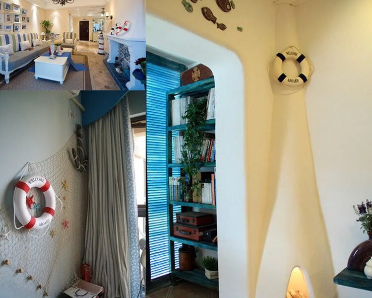 Mediterranean Style Wood Nautical Welcome Board Blue White Lifebuoy for Bar Window