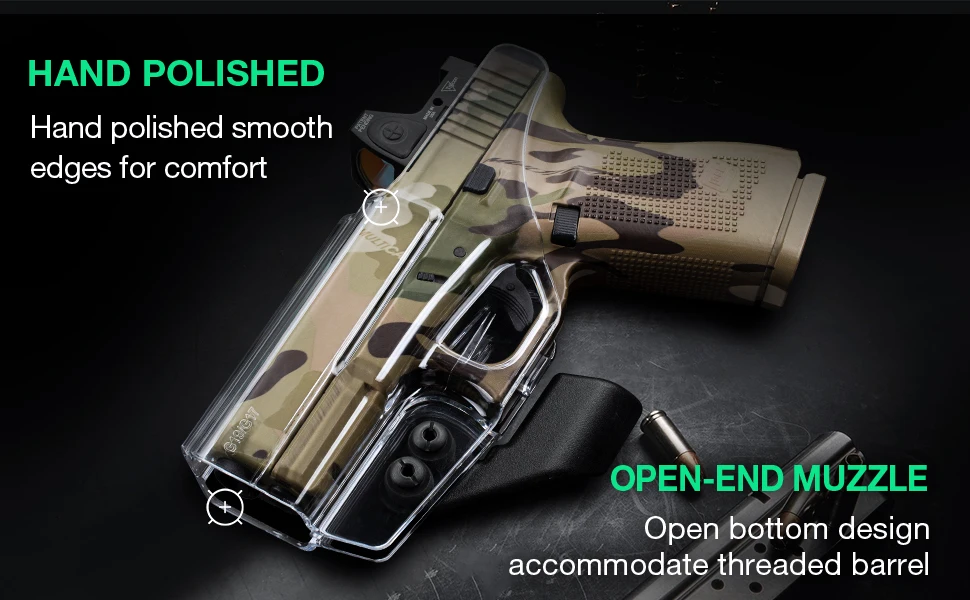 · FULL COVER TRIGGER GUARD & OPEN MUZZLE CUT: IWB are designed to covered magazine button - Over-Cut open end muzzle accommodate with threaded barrel
